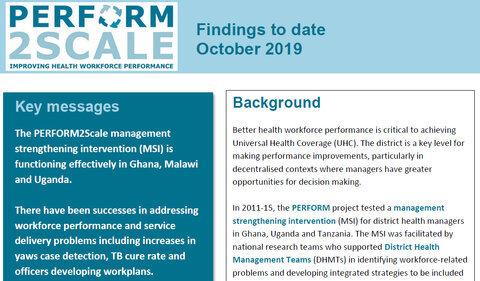 Our latest briefing paper is now available. It presents the results of a consortium-wide evaluation, 18 months into the PERFORM2Scale programme, and gives an overview of progress to date in each of the participating countries - Ghana, Malawi and Uganda.