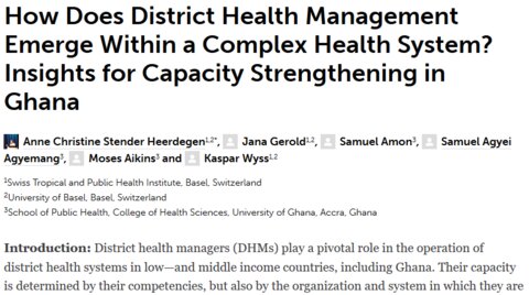 The paper - 'How Does District Health Management Emerge Within a Complex Health System? Insights for Capacity Strengthening in Ghana' - explores how district health management emerges from contextual, organisational, and individual factors.